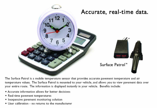 Marlin Controls offers the Surface Patrol, a mobile temperature sensor used to detect possible freezing temperatures on the pavement. It features a non-contact infrared sensor for measuring pavement temperature, and also measures the ambient (air) temperature.